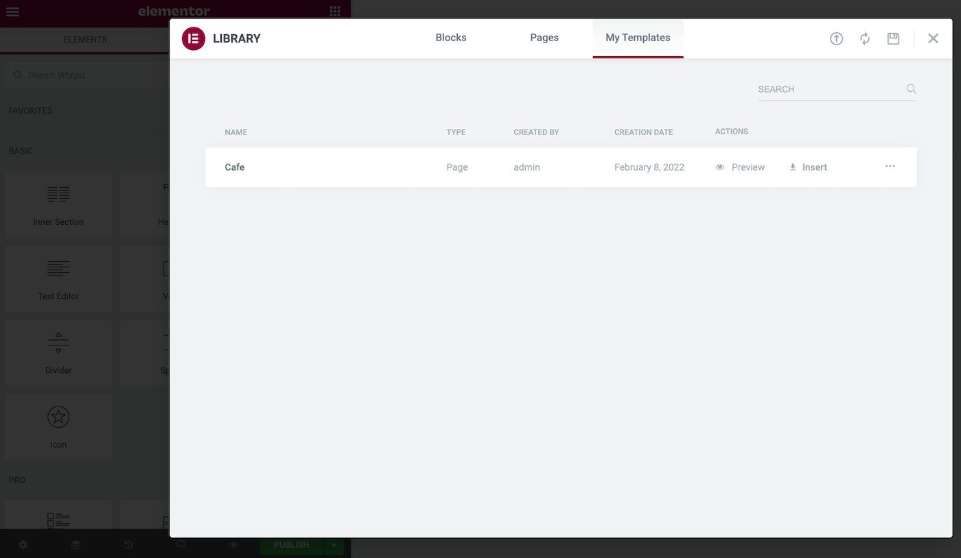Click on Import Template and select your file.json or .zip. Elementor will analyze the content and add the pages to your library.
